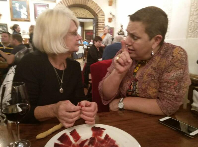 I was very tired last night when I wrote the blog and forgot to mention that not only did our friends at the bar last night treat us to delicious Iberian ham but they also covered our drinks bill for four glasses of wine. We were touched by their kindness and generosity. As I've written before, this is the alternate reality to the hatred, anger and bitterness that assaults us every time we read 'the news'. As we sat talking with them and using Google translate to get over the difficult bits, a baby buggy was parked next to our table with an adorable seven months old baby fast asleep inside. I couldn't think of a better way to introduce that little child into the social world of adults than for her to wake up and see everyone around her laughing and smiling, drinking delicious wine and eating delectable food. Standing near us was a family with three generations with the grandmother laughing with her youngest granddaughter who looked about eight. I loved the lack of division between the adult and children's world. Had the baby been a bit older I might have given her some advice on how not only is drinking wine with friends one of the great experiences of life, but that it can also help with long-distance air travel. I regretted not having a copy of the Rubyat of Omar Khyam to plonk in her buggy for her to read later.
