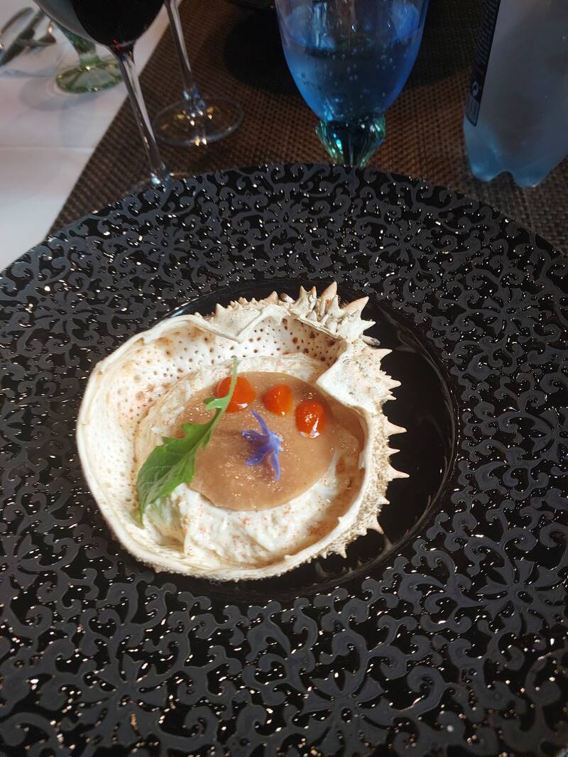 The crab salad was delicious and copious. The small monkfish portion appeared with two prawns clinging to it and was  accompanied by beans cooked with  rather too much garlic and olive oil. Chef obviously didn't want to pollute the pink, white and green arrangement with anything so common as potato, rice or pasta so we had to readjust our appetites to a relatively small but artistically perfect dish.